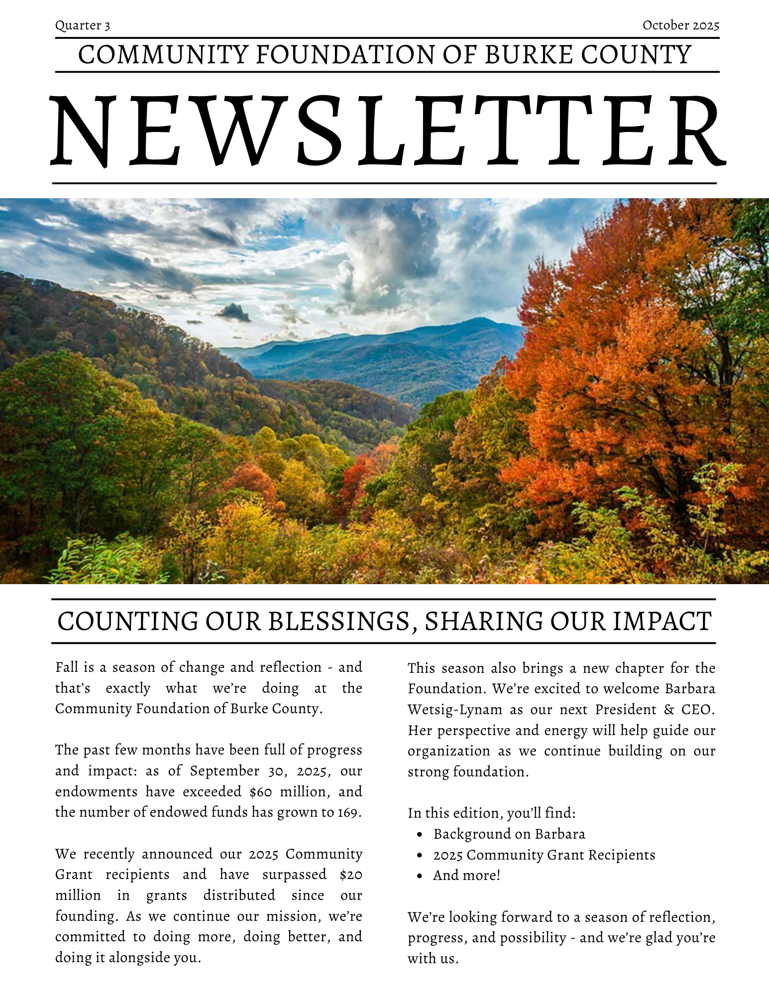 Discover how the Community Foundation of Burke County is making a lasting difference in Burke County. From supporting local nonprofits to empowering donors to leave a legacy, our 2024 Annual Report highlights a year of growth, impact, and community stories.